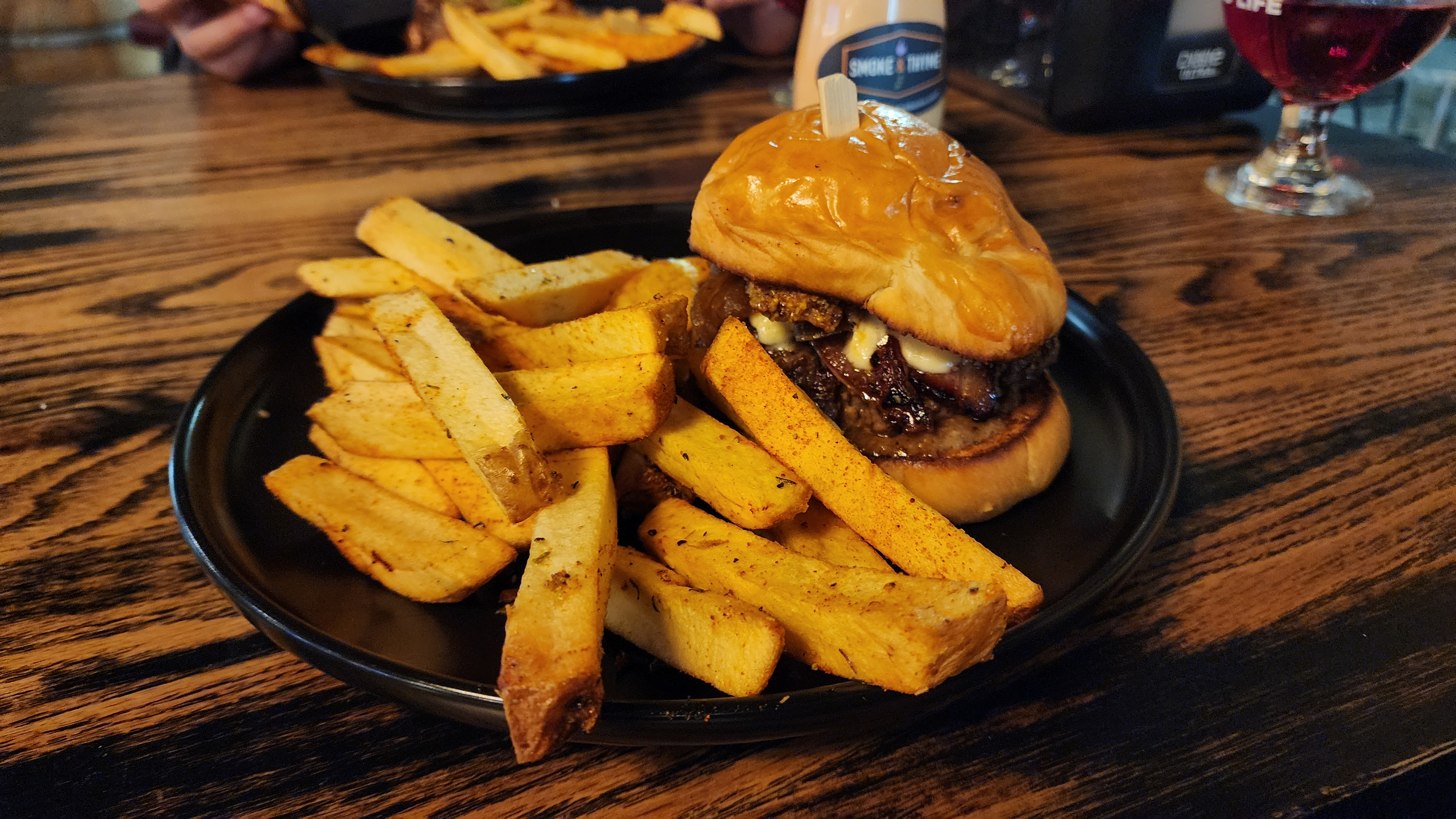 I ended up getting the Beer & Bacon Burger, pretty much every part of the burger was beer adjacent. Scotch Ale bacon sauce, bourbon bacon jam, beer onions, all on a brioche bun with some other goodies in there as well. We ate in so we didn’t have to worry about the burger getting smooshed in transit. The Presentation was okay nothing fancy but it wasn’t terrible. I thought the bacon and the cheese sauce were the dominant flavors. but with bacon sauce and bacon jam that is to be expected. The buns were already getting a bit soggy by the time I picked it up but I would not be surprised if the buns were homemade and were actually one of my favorite parts of the burger. I think the burger needed a little less of the cheese sauce and a little bit more of the jam and bacon sauce. I ended up scoring the burger a solid 6.5. Ian got the brisket burger and gave his burger a 7.5.