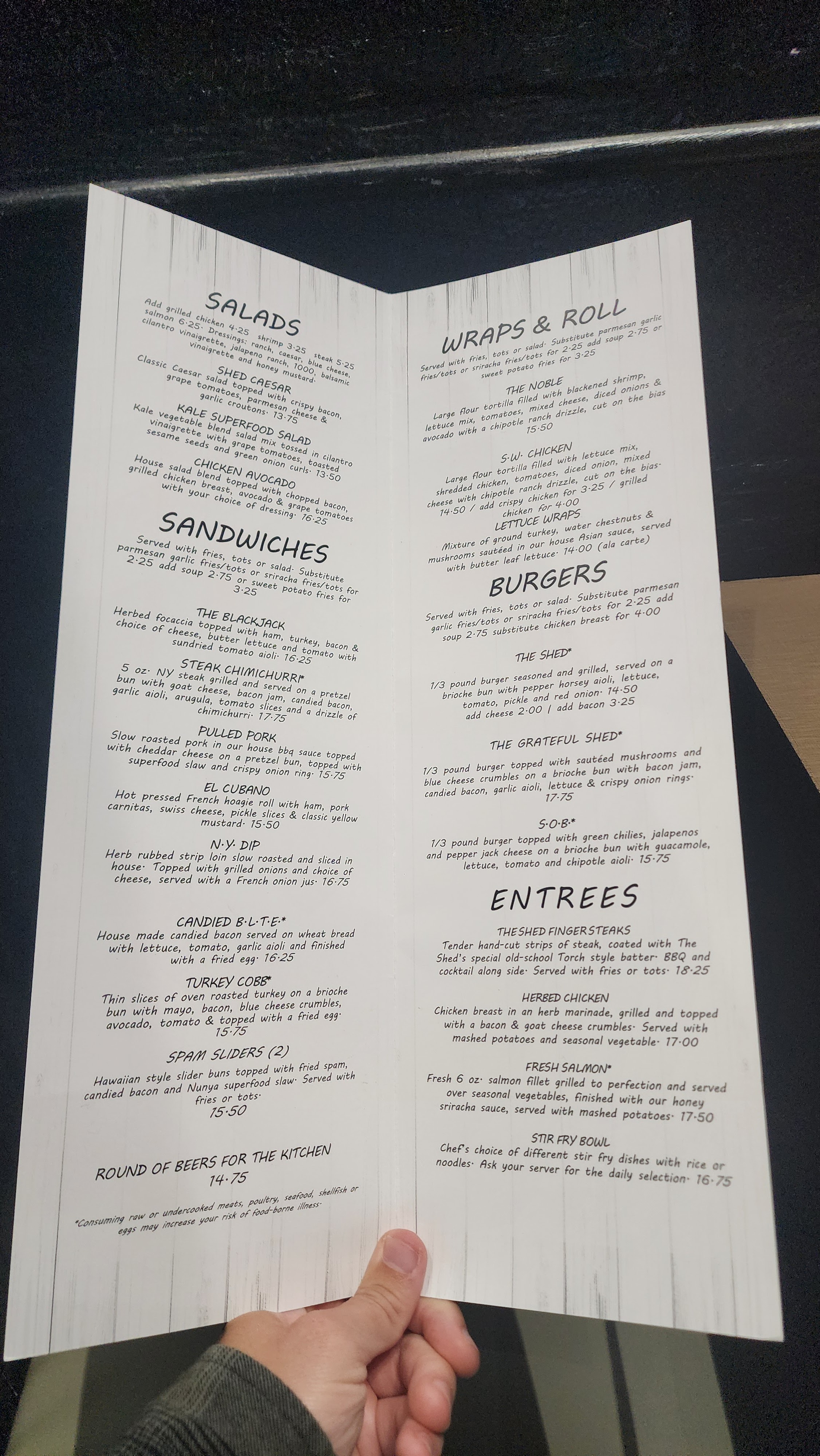 The shed primarily focuses on Sandwiches, with additional options for entrées, burgers, and salads, but does a good job of incorporating a variety of flavors and food types. In addition, they have a great selection of shareables/appetizers. I think if they had a few more options for burgers and other entrees, they could bump up that score a bit. The options you do have do have some stuff I don’t usually see at different places. I am looking at your spam sliders and fried Oreos. If you have picky eaters, I’m sure they’ll be able to find something they’ll like.